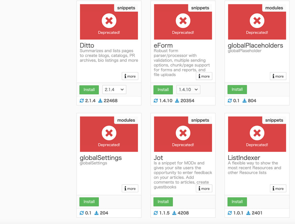一方で、見慣れたスニペットは非推奨に…でもそういえば、DittoもMODxで既に非推奨だった。そうだな、もういいかげん卒業しないと。